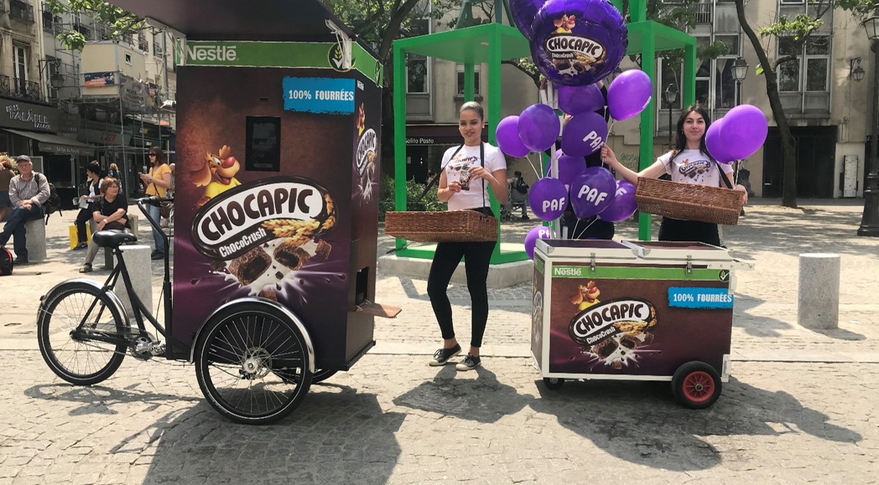 C’était il y a quelques années… et ça fonctionne toujours ! Un roadshow immersif, 4 semaines de tournée, 100 000 échantillons distribués, un jeu 100 % gagnant et un triporteur digital permettant de créer des GIFs animés autour de l’univers “Choc!”. La preuve qu’un bon mix expérience + visibilité reste une valeur sûre.